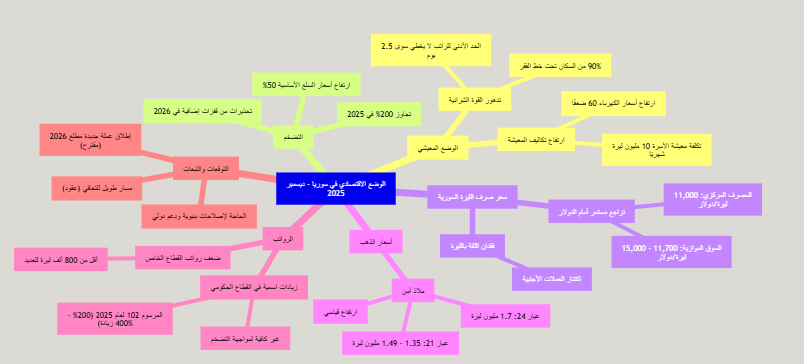 الرسم البياني أعلاه يمثل خريطة ذهنية توضح الترابط بين مختلف الجوانب الاقتصادية في سوريا خلال ديسمبر 2025. تبرز الخريطة كيف أن تدهور القوة الشرائية وارتفاع التضخم يتأثران بشكل مباشر بتقلبات سعر صرف الليرة وارتفاع أسعار الذهب. كما تشير إلى أن الزيادات في الرواتب، وإن كانت كبيرة اسميًا، لم تنجح في تحسين الوضع المعيشي بشكل فعال.