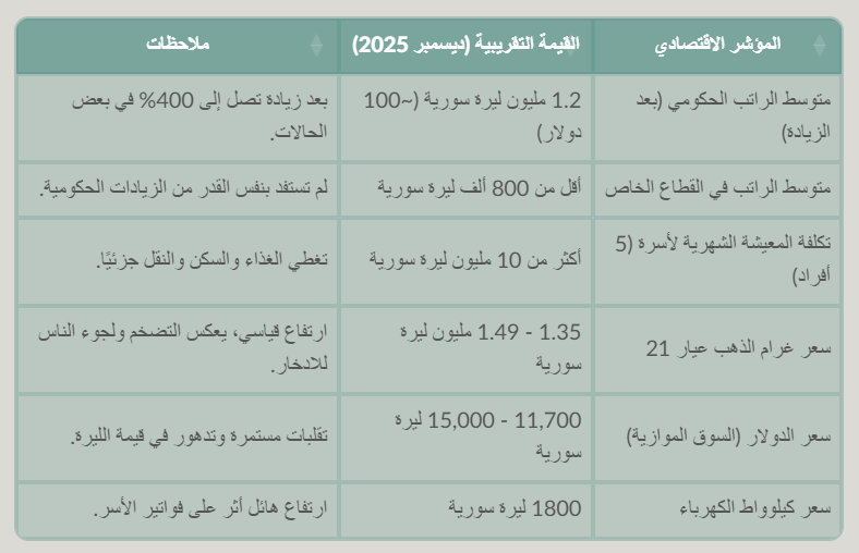 يوضح الجدول التالي التباين الصارخ بين متوسط الرواتب وبعض تكاليف المعيشة الأساسية في سوريا خلال ديسمبر 2025. الأرقام تعكس التحدي الهائل الذي يواجهه المواطن السوري في تأمين احتياجاته الأساسية.