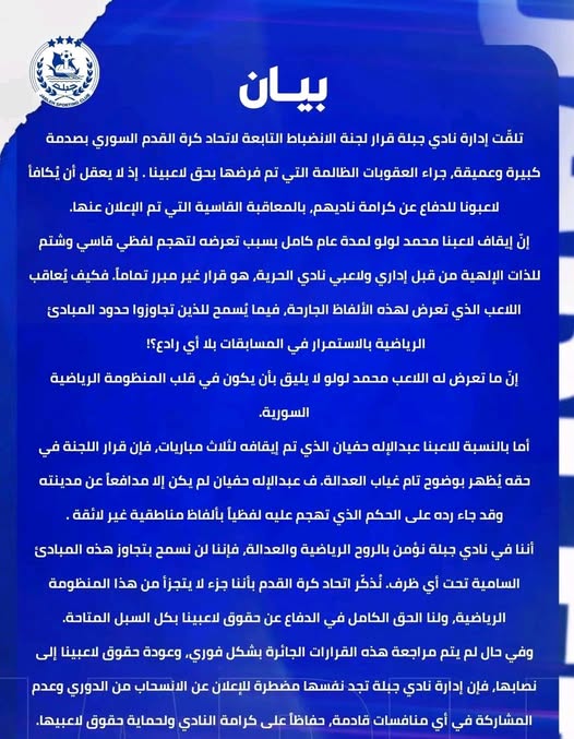 أصدرت إدارة نادي جبلة بياناً شديد اللهجة، أبدت فيه صدمتها العميقة من قرارات لجنة الانضباط التابعة للاتحاد السوري لكرة القدم، واصفة العقوبات المفروضة بحق لاعبيها بـ “الظالمة والقاسية”.