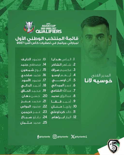 أعلن المدير الفني للمنتخب السوري لكرة القدم، الإسباني خوسيه لانا، القائمة النهائية لـ”نسور قاسيون” التي ستواجه منتخب ميانمار في جولتي الذهاب والإياب ضمن تصفيات كأس آسيا 2027.