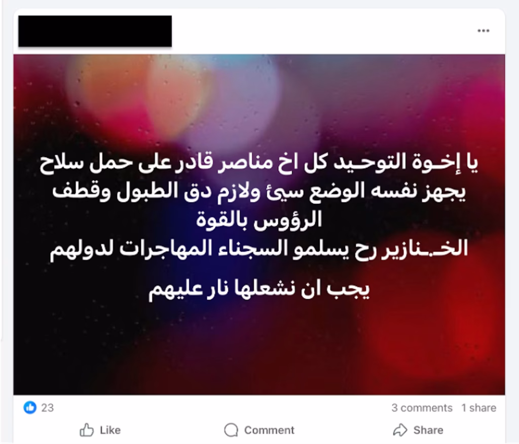لم يقتصر النشاط الرقمي على الدعم اللوجستي بل شمل حملات تحريضية تدعو لرفض سلطة الحكومة السورية والاستعداد للمقاومة المسلحة إذ رصد التحقيق منشورات تدعو المتعاطفين لـ “قطف رؤوس” عناصر القوات الحكومية واستخدام ألفاظ تحقيرية ضدهم بالتزامن مع مخاوف من محاولات إعادة المحتجزين الأجانب إلى بلدانهم الأصلية مما يؤكد استمرار الخطر الذي يمثله هؤلاء العناصر على أمن المنطقة واستقرارها