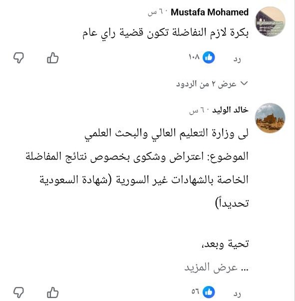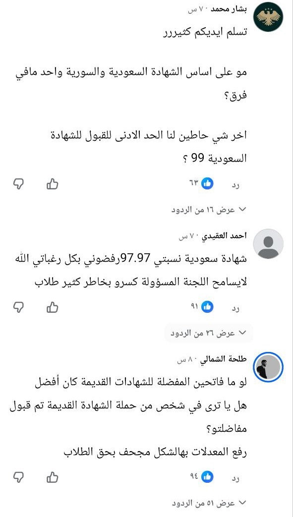 وقال أحد المعلقين: “مو على أساس الشهادة السعودية والسورية واحد ما في فرق؟”، فيما كتب آخر: “شهادتي سعودية ونسبتي 97.97 ورفضوني بكل رغباتي، الله لا يسامح اللجنة، كسروا بخاطر كثير طلاب.”