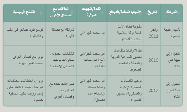 يلخص الجدول التالي أبرز المراحل التي مرت بها جبهة النصرة في تطورها إلى هيئة تحرير الشام، مع الأسباب والدوافع والنتائج.