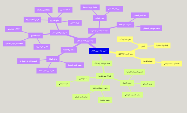 يوضح المخطط الذهني أدناه المسار المعقد لتطور جبهة النصرة إلى هيئة تحرير الشام، مبرزًا الدوافع الرئيسية لكل مرحلة والتحديات التي واجهتها.