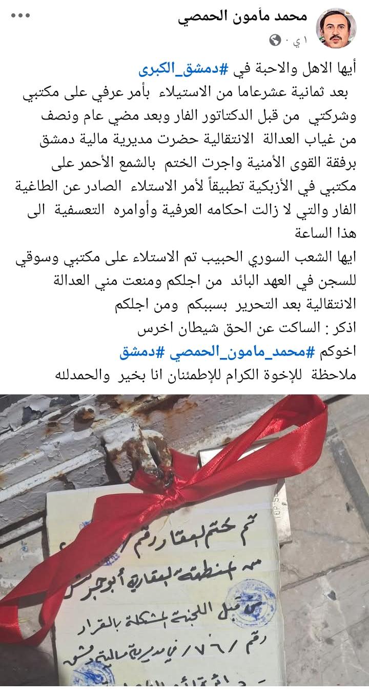 إغلاق مكتب “مأمون الحمصي” بالشمع الأحمر في دمشق: تساؤلات حول العدالة الانتقالية