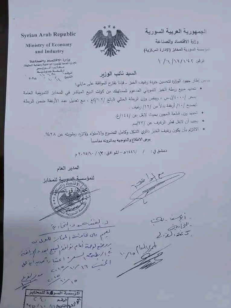 أصدرت المؤسسة السورية للمخابز تعميماً يقضي بتعديل جديد على مواصفات رغيف الخبز المدعوم، يبدأ تنفيذه اعتباراً من اليوم الخميس.
