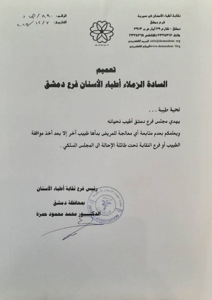 أصدر مجلس فرع دمشق لنقابة أطباء الأسنان توجيهاً صريحاً لأعضائه يمنعهم من متابعة علاج أي مريض بدأ رحلته العلاجية لدى طبيب آخر، إلا في حالتين: