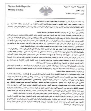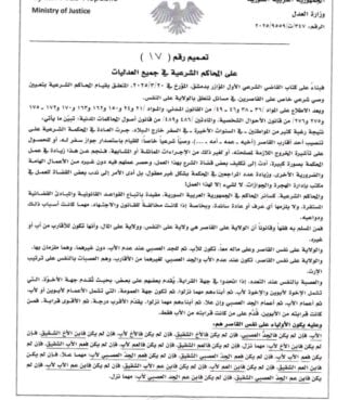 أصدرت وزارة العدل السورية تعميماً إلى المحاكم الشرعية، أثار موجة من الاستياء في الأوساط الحقوقية، لكونه يجرد الأم من حق الولاية على أطفالها القُصّر في حال غياب الأب، ويكرّس السلطة للأقارب الذكور.