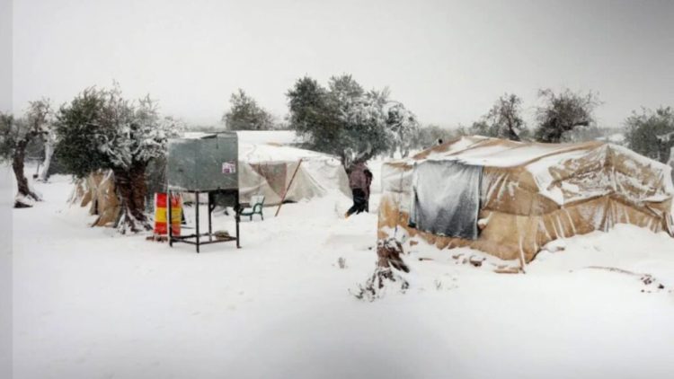يعيش مدحت أحمد العلوش وعائلته في مخيم “تجمع لأجلكم” بين قريتي قاح وعقربات بريف إدلب، بعد أن وجد قريته الأصلية في ريف حماة غير صالحة للعيش. يقول أحمد، الذي يعمل مدرسًا ويتقاضى راتبًا شهريًا لا يتجاوز 125 دولارًا، إن المخيم يفتقر إلى الماء والخبز والسلال الإغاثية، فيما تتضرر المباني الأسمنتية التي بناها السكان إثر هطول الثلوج.