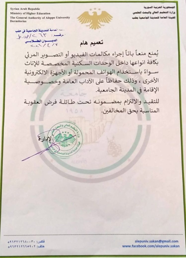• منع مكالمات الفيديو: تعميم صادر عن المدينة الجامعية بحلب يحظر إجراء مكالمات الفيديو أو التصوير المرئي داخل وحدات الطالبات السكنية، بدعوى الحفاظ على “الآداب العامة”.