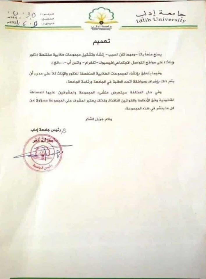 ويعيد هذا الجدل إلى الواجهة تعميماً سابقاً صدر عن جامعة إدلب (الحرة) عام 2021، خلال فترة إدارة “هيئة تحرير الشام” للمنطقة آنذاك، وفرض قيوداً على مجموعات التواصل الطلابية، ما يعزز المخاوف من تكرار النهج ذاته اليوم، خاصة بعد وصولها إلى الحكم في سوريا بعد كانون الأول/ديسمبر 2024.