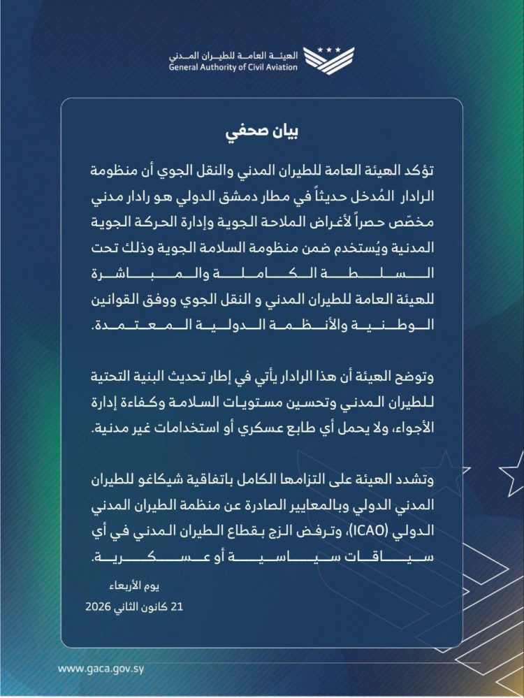 أصدرت الهيئة العامة للطيران المدني السوري بياناً توضيحياً حاسماً بشأن منظومة الرادار الجديدة التي تم تركيبها في مطار دمشق الدولي، مؤكدة أنها تهدف حصراً لتطوير البنية التحتية الجوية المدنية.