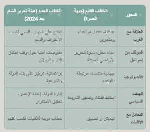 الخطاب الجديد، بعد سقوط الأسد، يركز على بناء الدولة، والتعاون الدولي، ومعالجة قضايا الأمن الإقليمي. هذا التحول ليس مجرد تكتيك، بل يعكس تحولًا أيديولوجيًا محتملاً داخل القيادة، أو على الأقل براغماتية قوية للتكيف مع الواقع السياسي الجديد. يمكن تلخيص هذا التحول في الجدول التالي: