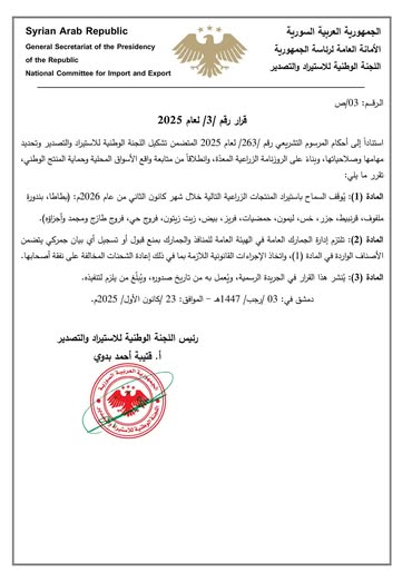 أصدرت اللجنة الوطنية للاستيراد والتصدير في سوريا القرار رقم (3)، الذي يقضي بإيقاف استيراد مجموعة واسعة من المنتجات الزراعية والحيوانية خلال شهر كانون الثاني من عام 2026.