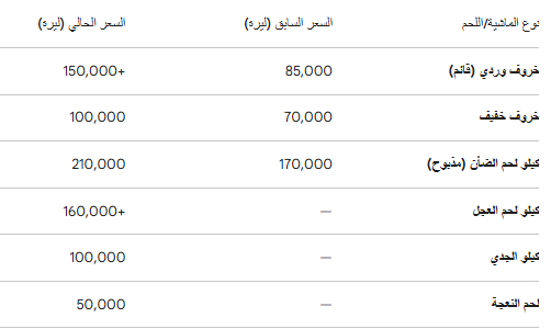 جدول أسعار المواشي واللحوم في ريف دمشق (بالليرة السورية)