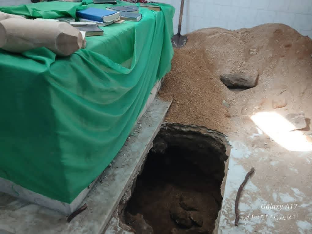 وبدا الضريح متضرراً بشكل واضح، مع آثار كسر وانكشاف داخلي يدل على العبث المباشر به.