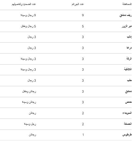 يوضح الجدول التالي خريطة الجريمة الجنائية وأعداد الضحايا في كل محافظة وفق توثيقات المرصد السوري: