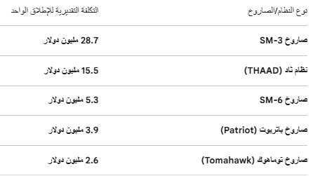 وفقاً للتحليل، استخدمت القوات الأمريكية خلال 39 يوماً فقط من القتال كميات هائلة من الصواريخ الاعتراضية والأنظمة المتقدمة، وتُظهر تكلفة الإطلاق الواحد حجم الإنفاق المرعب: