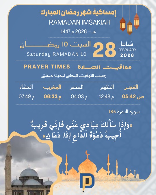 رئيسي إمساكية شهر رمضان المبارك يوم السبت 28 شباط آخر تحديث 2026/02/27 5:28م أكمل القراءة أهلا رمضانإمساكية رمضانإمساكية شهر رمضانالحلويات الرمضانية شارك FacebookTwitterWhatsAppFacebook MessengerTelegram