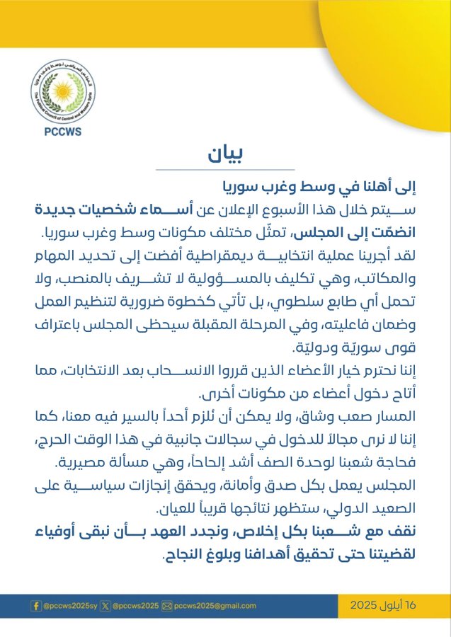 أعلن المجلس السياسي لوسط وغرب سوريا  PCCWS أنه سيتم خلال هذا الأسبوع الإعلان عن أسماء شخصيات جديدة انضمت إلى المجلس، لتُمثل مختلف مكونات وسط وغرب سوريا.