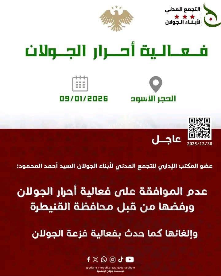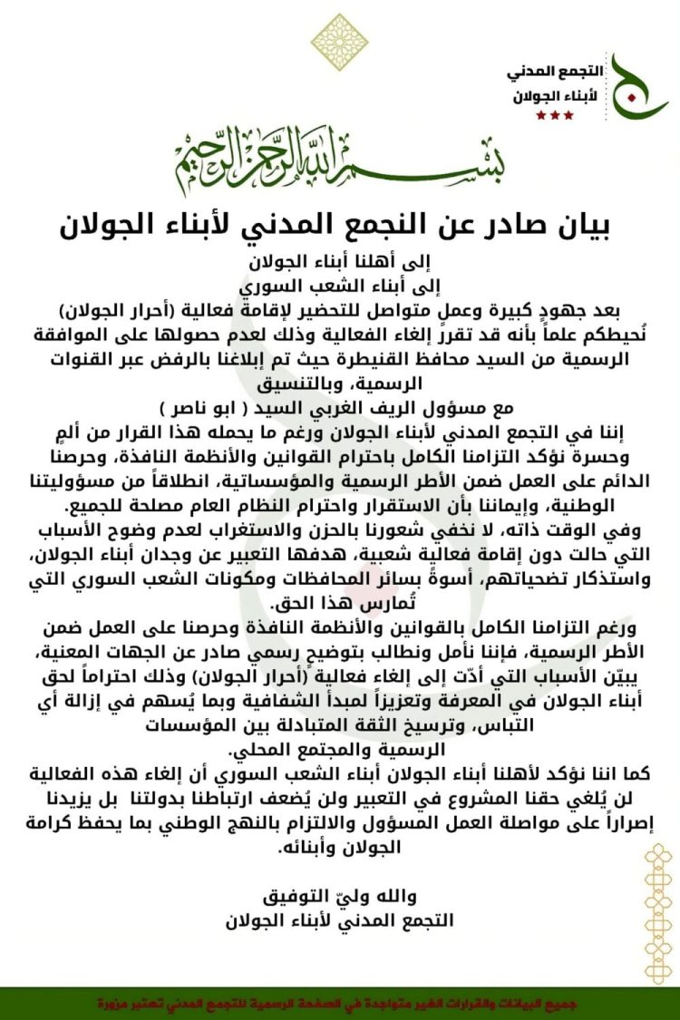من جهته، دافع التجمع المدني لأبناء الجولان عن أهداف فعالية “أحرار الجولان”، التي كان مقررًا إقامتها يوم الجمعة 9 كانون الثاني/يناير 2026 في مدينة الحجر الأسود بريف دمشق، مؤكدًا أنها فعالية وطنية توثيقية.